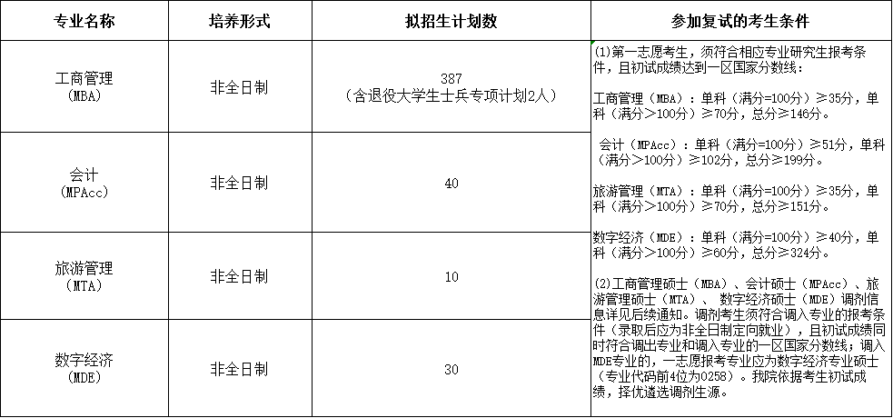 (一)符合我校2026年工商管理硕士(MBA)、会计硕士(MPAcc)、旅游管理硕士(MTA)、数字经济硕士(MDE)专业学位研究生报考条件和复试要求的考生均可参加复试。