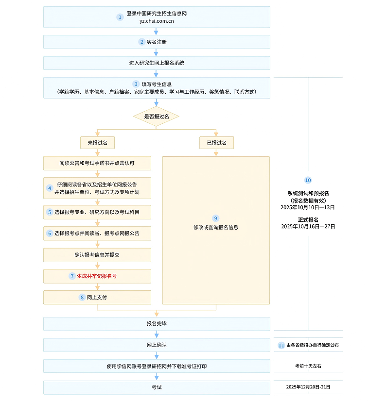 (1)登录研招网。考生应在规定时间登录“中国研究生招生信息网”(网址:https://yz.chsi.com.cn)认真阅读2026年全国硕士研究生招生考试报名公告和报名须知,按省级教育招生考试机构、报考点以及招生单位的网报公告要求参加网上报名和网上确认,并按规定缴纳报考费。