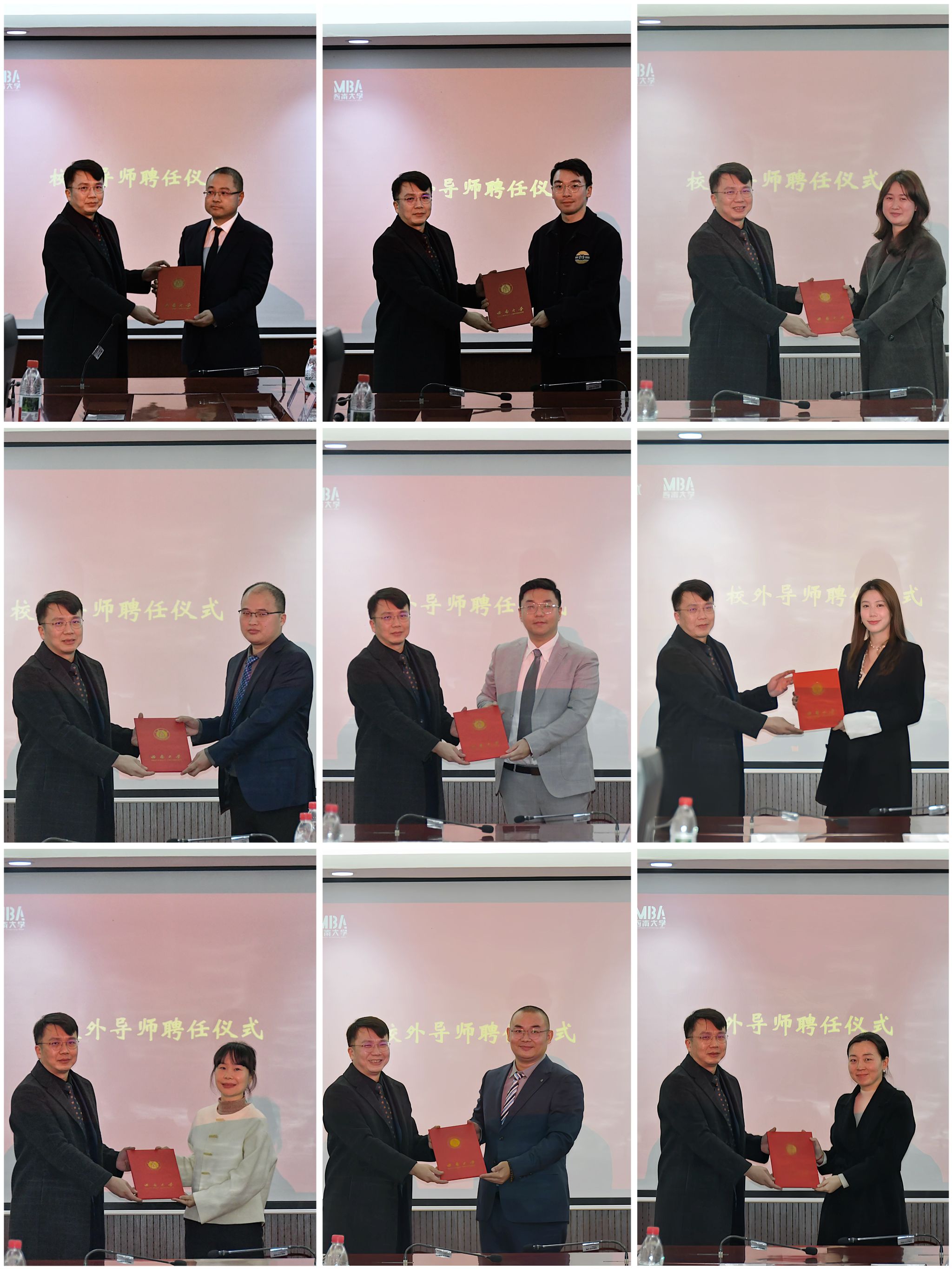 聘任仪式上,副院长甘晓龙为新受聘的MBA校外导师逐一颁发聘书并合影留念。